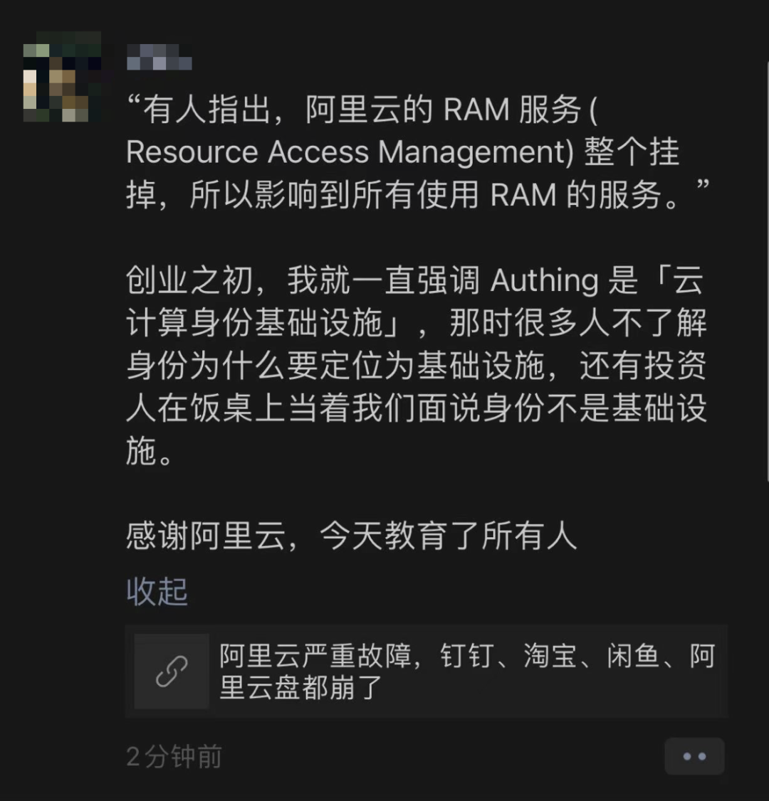 如果真的是这样的原因导致认证服务不可用,那可真的是 草台班子 到家了。尽管听上去很离谱,但也不算太令人惊奇。再次强调,以上为路边社消息与合理推论,具体事故原因请以阿里云官方给出的复盘分析报告为准。