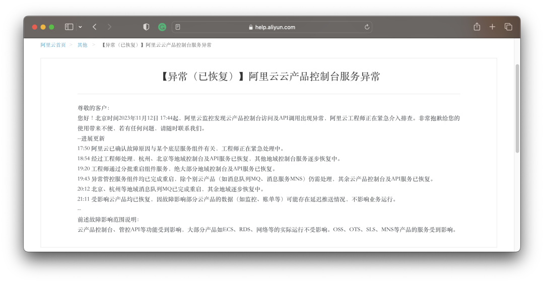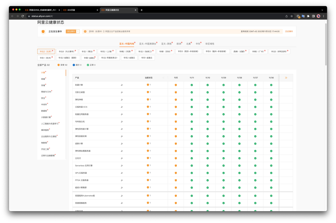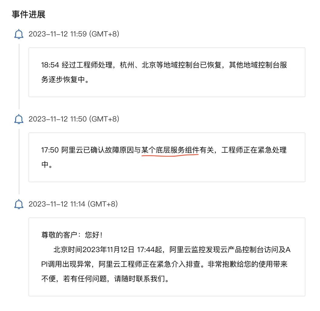 11 月 12 日,也就是双十一后的第一天,阿里云发生了一场史诗级大翻车。根据阿里云官方的服务状态页 [1],全球范围内所有可用区 x 所有服务全部都出现异常,时间从17:44 到 21: 11,共计 3 小时 16 分钟。